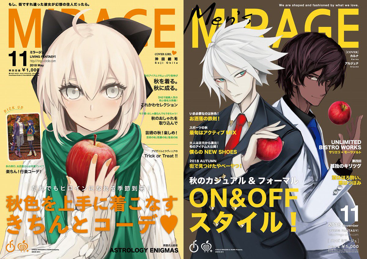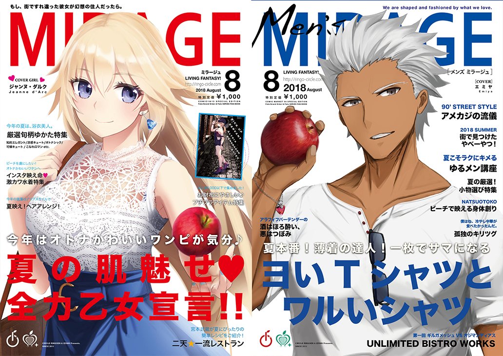 毎度おまたせです!ファッション雑誌風合同誌「Fate/MIRAGE」「Fate/Men's MIRAGE」最新号!去年の夏の頒布から驚くほど沢山の反響を頂き、おかげさまで㊗一周年!これも応援してくれた皆様のおかげです(;ワ;)✨ありがとうございます!これからも頑張ります!詳細はIZUNN(@IZUNN_mirage)から🍎🍏