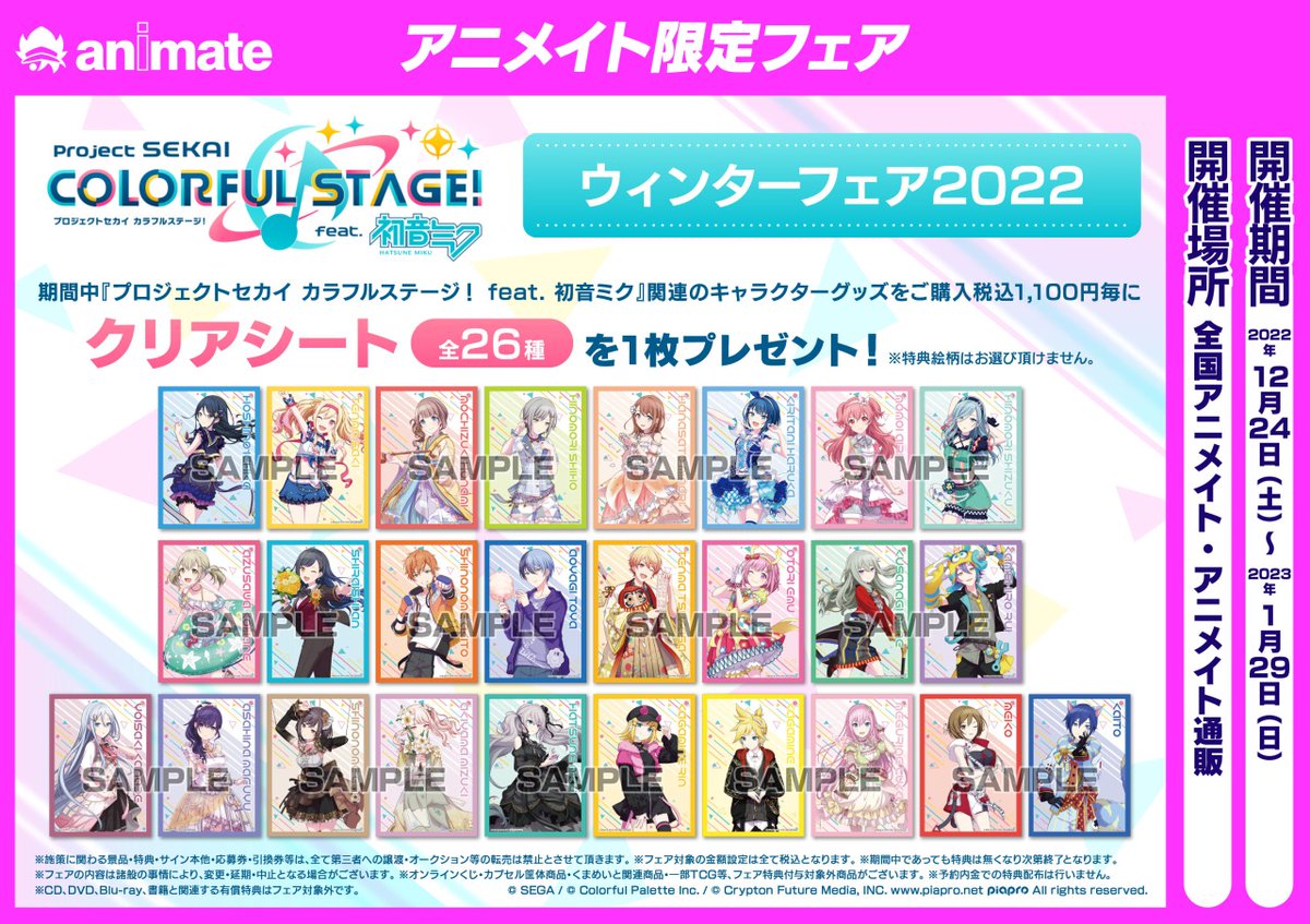 対象商品を1,100円購入毎に全26種のうちランダムで1枚クリアシートが配布されます。