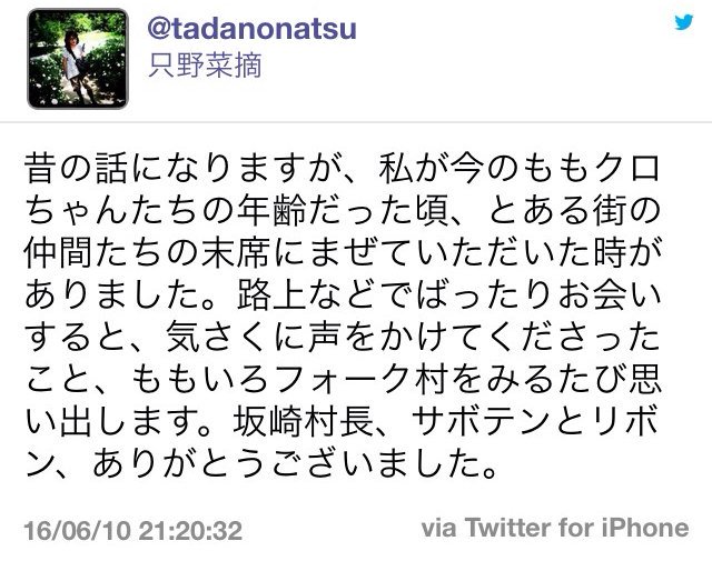 昔の話になりますが、私が今のももクロちゃんたちの年齢だった頃、とある街の仲間たちの末席にまぜていただいた時がありました。路上などでばったりお会いすると、気さくに声をかけてくださったこと、ももいろフォーク村をみるたび思い出します。坂崎村長、サボテンとリボン、ありがとうございました。