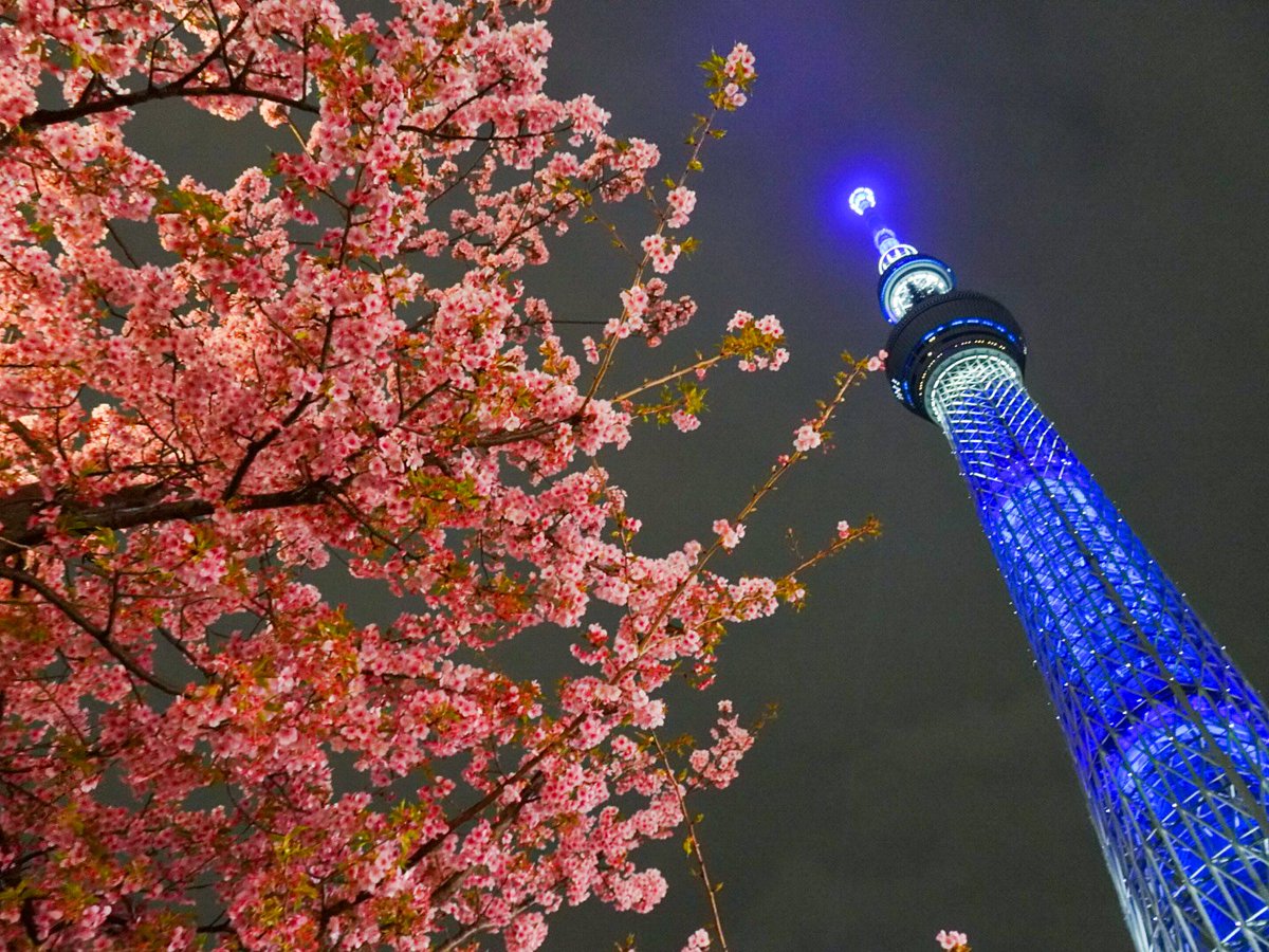 青色のスカイツリーと河津桜
