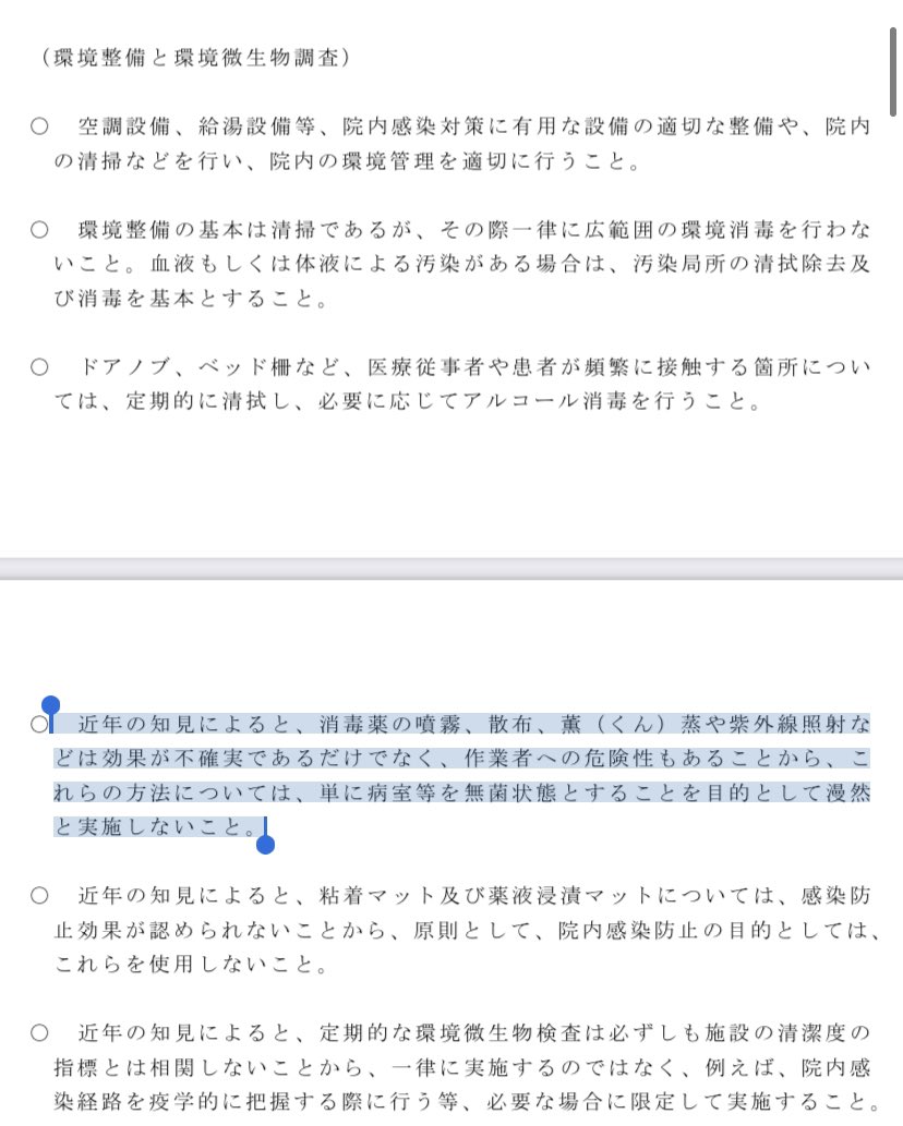 病院感染管理の領域では、コロナ発生以前から、消毒薬の噴霧は作業者に対する毒性があることから、行わないことが標準的な考え方になっています。