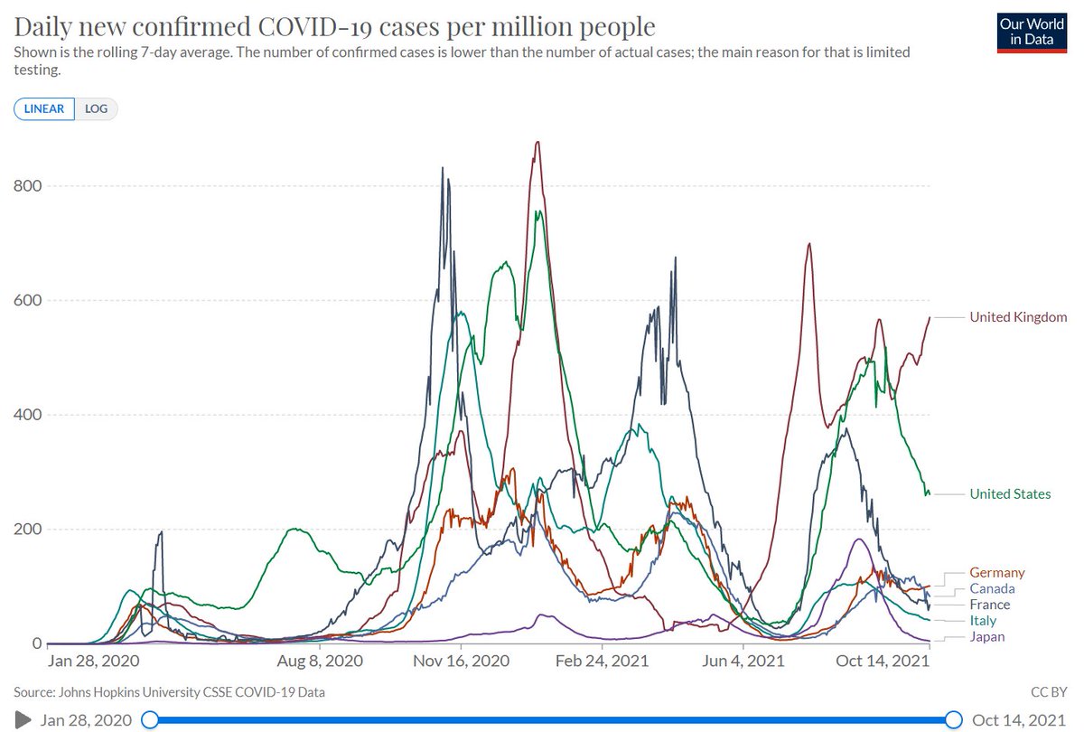 日本て、短期間(第5波最中)にどかっと接種が進んで、9月10月は接種完了後間もない最強状態の人が大量爆誕したというのが今の状態につながっているのかもしれないね。そうだとすれば、4か月後(来年1~2月ごろ?)くらいから、効果が減弱しはじめるので、注意が必要かもね。