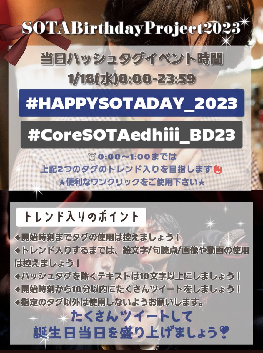 0:00-1:00はSOTAくんのお祝いタグとBMSG118のお祝いタグを併用し、トレンド入りを目指しましょう✨