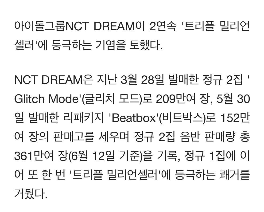 NCT DREAM 2연속 '트리플 밀리언셀러'