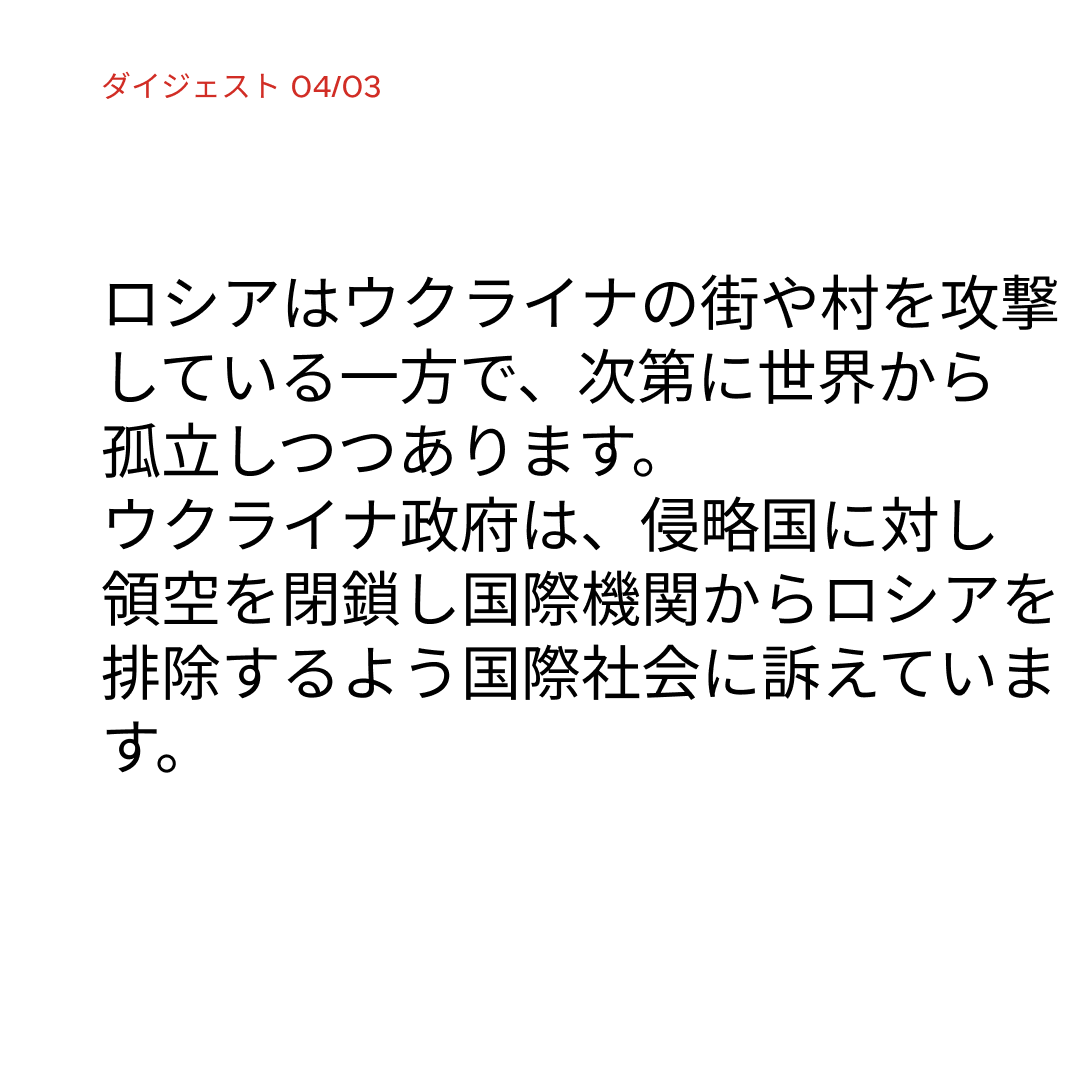 ミサイルと空爆は、軍だけでなく民間の家も狙っておます。それは重大な民間人の死傷者につながり、人々の士気をくじくものです。NATOがウクライナの空をロシアの航空機から閉じたら、侵略者のロシアにはウクライナ軍に勝る利点がなくなります。