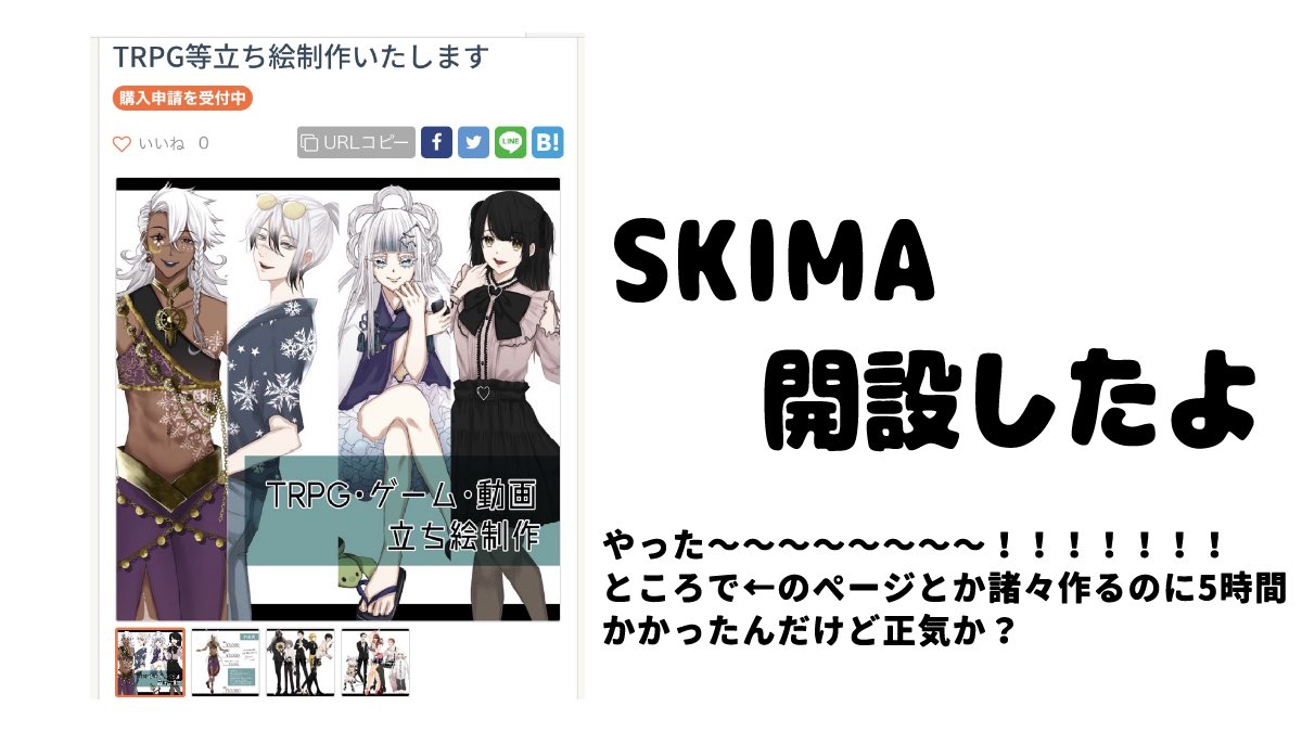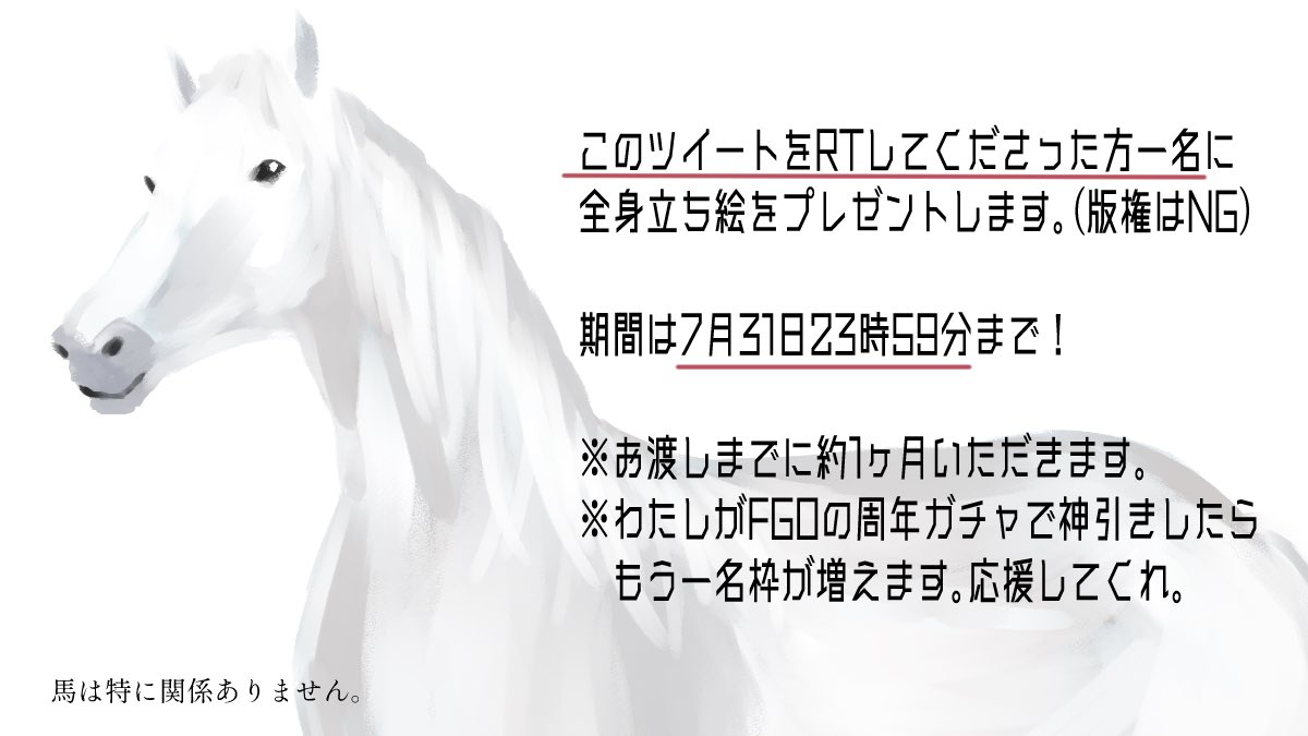🎁夏だ!毎日暑くね?こういうのやりたかったぞ立ち絵プレゼント🎁 8月分の新規立ち絵が全て終わってえらいのでSKIMAを開設しました 記念にTRPGで使える全身立ち絵を1名にプレゼントします❣️ 対象:1名 期間:7月31日23時59分まで 応募方法:このツイートをRT♻️ 備考:お渡しまでに約1ヶ月いただきます