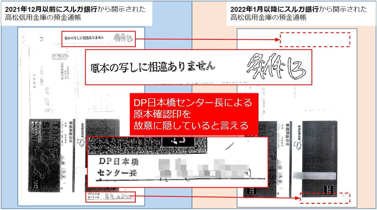 スルガ銀行からの開示資料に証拠隠蔽の痕跡があります。左の通帳にある原本確認の押印及びサインが右はありません。