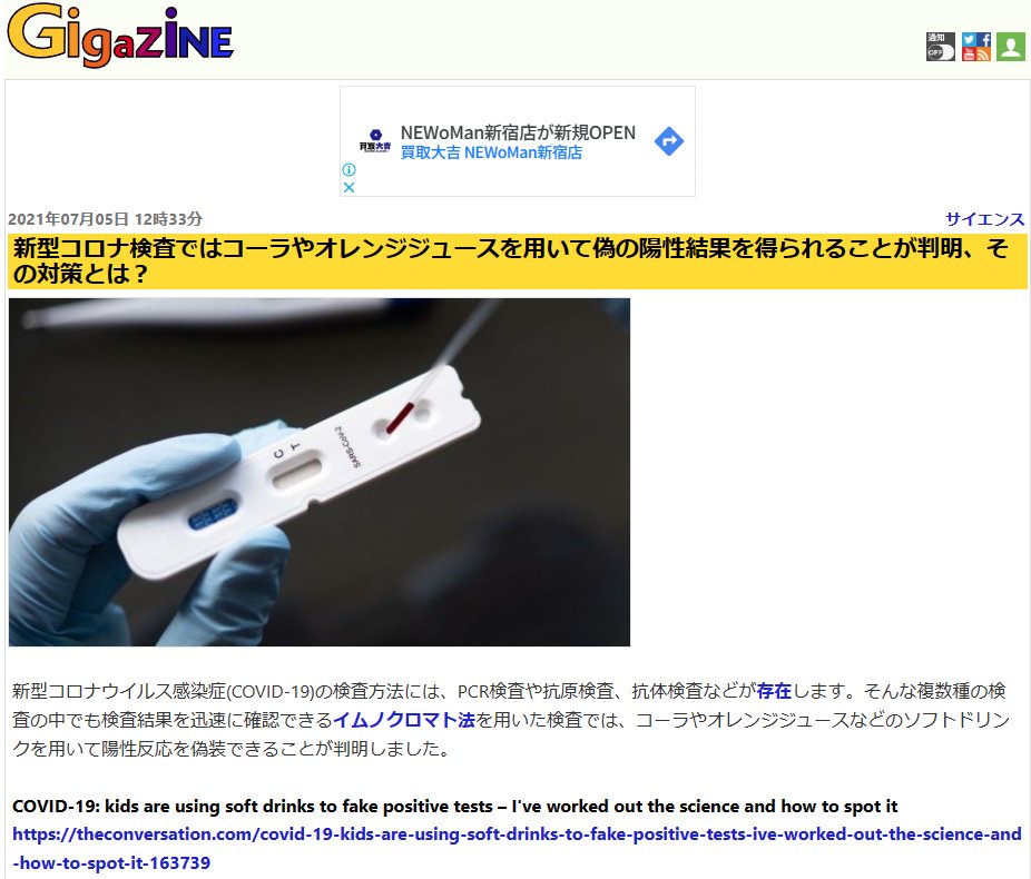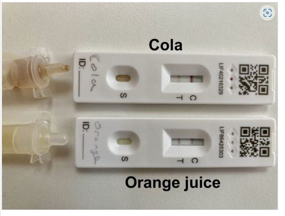 これ、PCRじゃなくて抗原検査なのですが、抗原検査は金コロイドで標識した抗体を利用してウイルスを検出しています。抗体は非常にデリケートなタンパク質のため、ジュースの酸性で壊れてしまったのでしょう。壊れた抗体が検出ラインで詰まってしまい、偽の陽性線を出してしまったと考えられます。→ twitter.com/moiara00o9/sta…