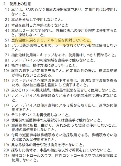 @Invesdoctor 室温に戻してから抗原検査キットのアルミ袋を開封するようにご注意下さい。冷たいものは吸湿しやすいです。