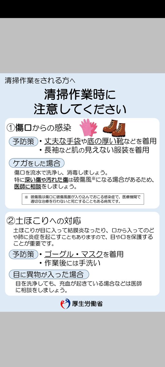 台風の後片付けをされる方。うっかり怪我をすると破傷風になることがあるので注意してください。もし深い怪我や汚れる怪我をされた場合は破傷風の危険性があるので医師にご相談を。 twitter.com/kamo_kamos/sta…