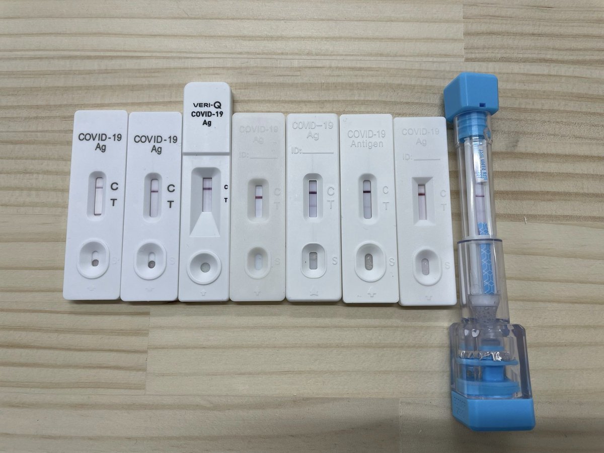 伸びてますが、コロナ抗原検査キットは下記の画像のようにさらに薄い陽性線で出る場合もあるので注意してください。発熱直後は陰性もしくは薄くでるので、各家庭2個用意して、24時間後の再検査を行ったほうが良いと思います。twitter.com/kamo_kamos/sta…