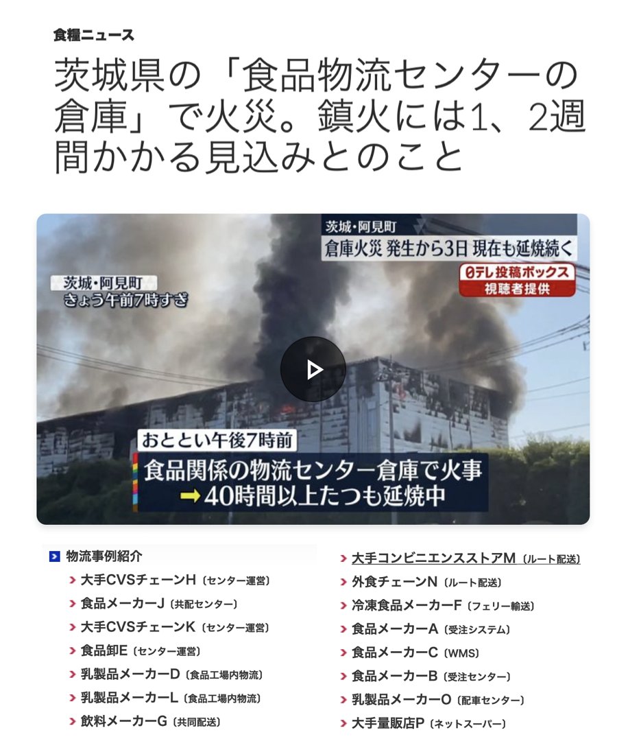 関東一円他、全国へも展開する大型の「食品物流センター」。原因は、書いていない。今後の国内展開に注視。