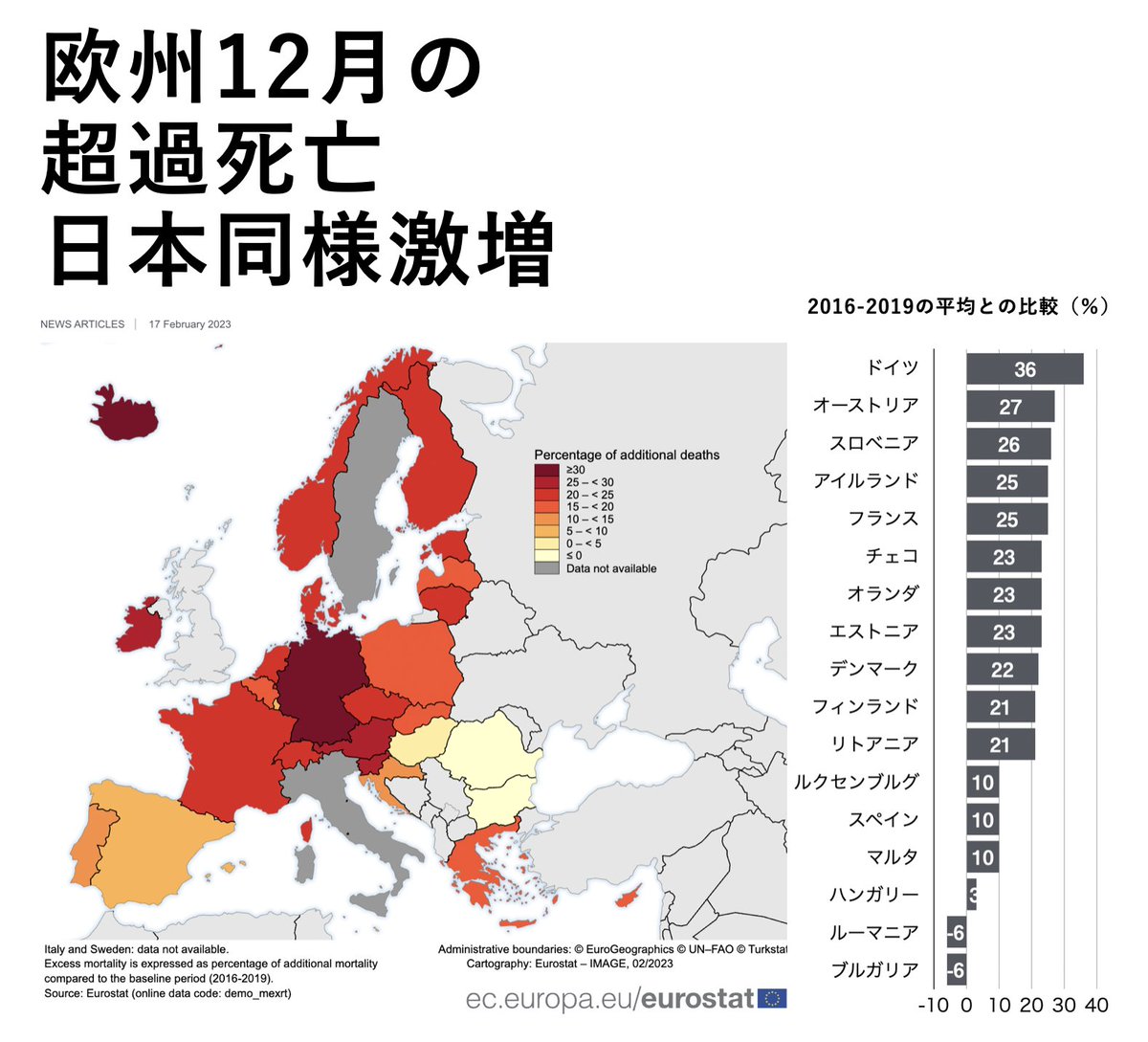 日本だけじゃなかった。欧州公式発表2022年12月の超過死亡数が、激増。最大はドイツの+36%。軒並み+20%台。これじゃ終わらせないだろうね、あいつらは。