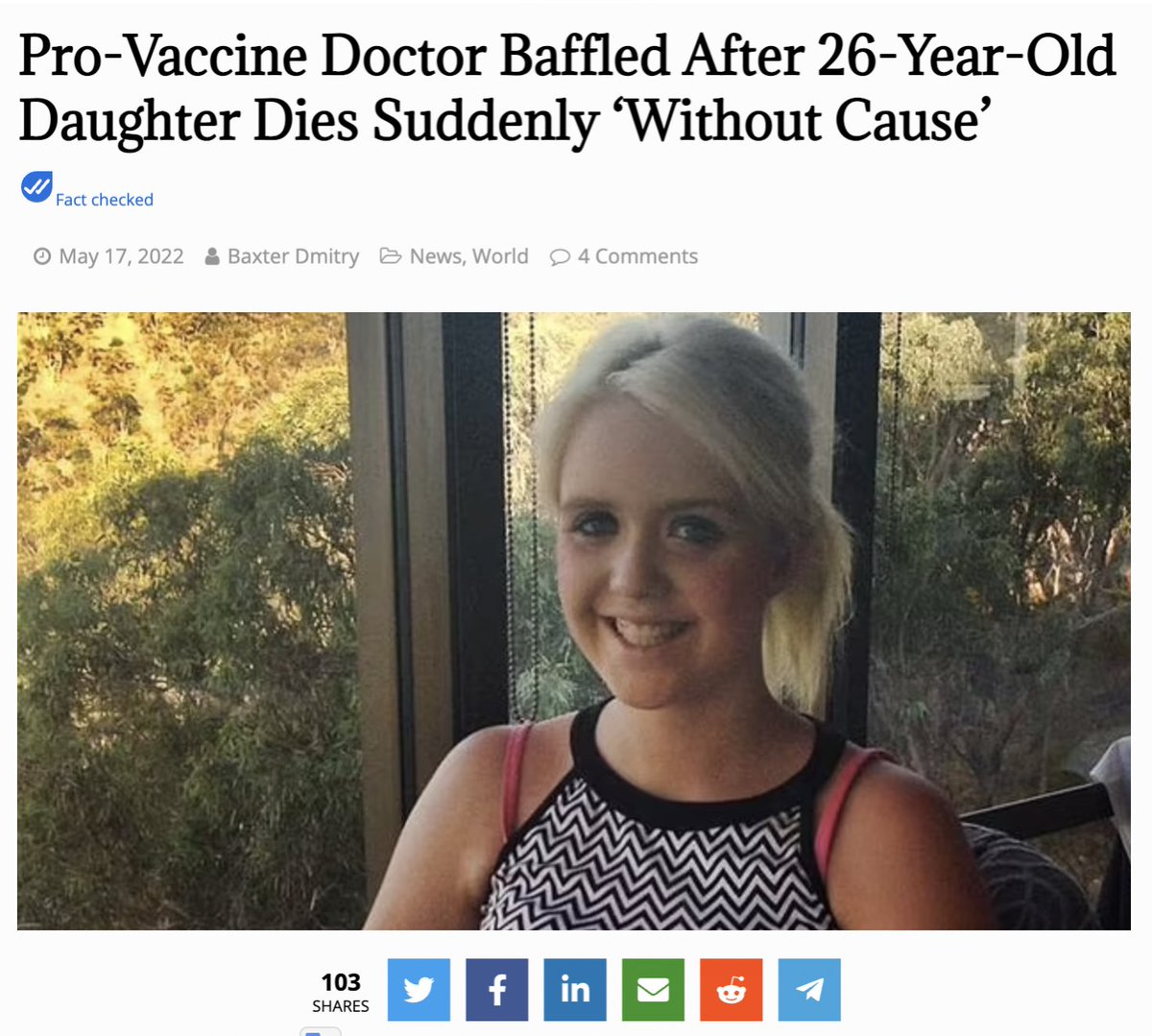 豪州:ワク推進派ミシェル・アチソン医師会会長は、26歳の娘が「就寝中に突然死」し、打ちひしがれている(就寝中の死亡が、ほんとに多い)