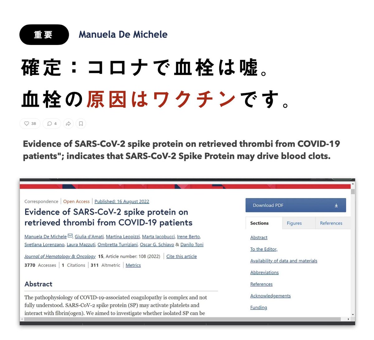 血栓の血小板からN蛋白ではなく「S蛋白だけ」が検出された。つまり、完全にワクチンが原因である。