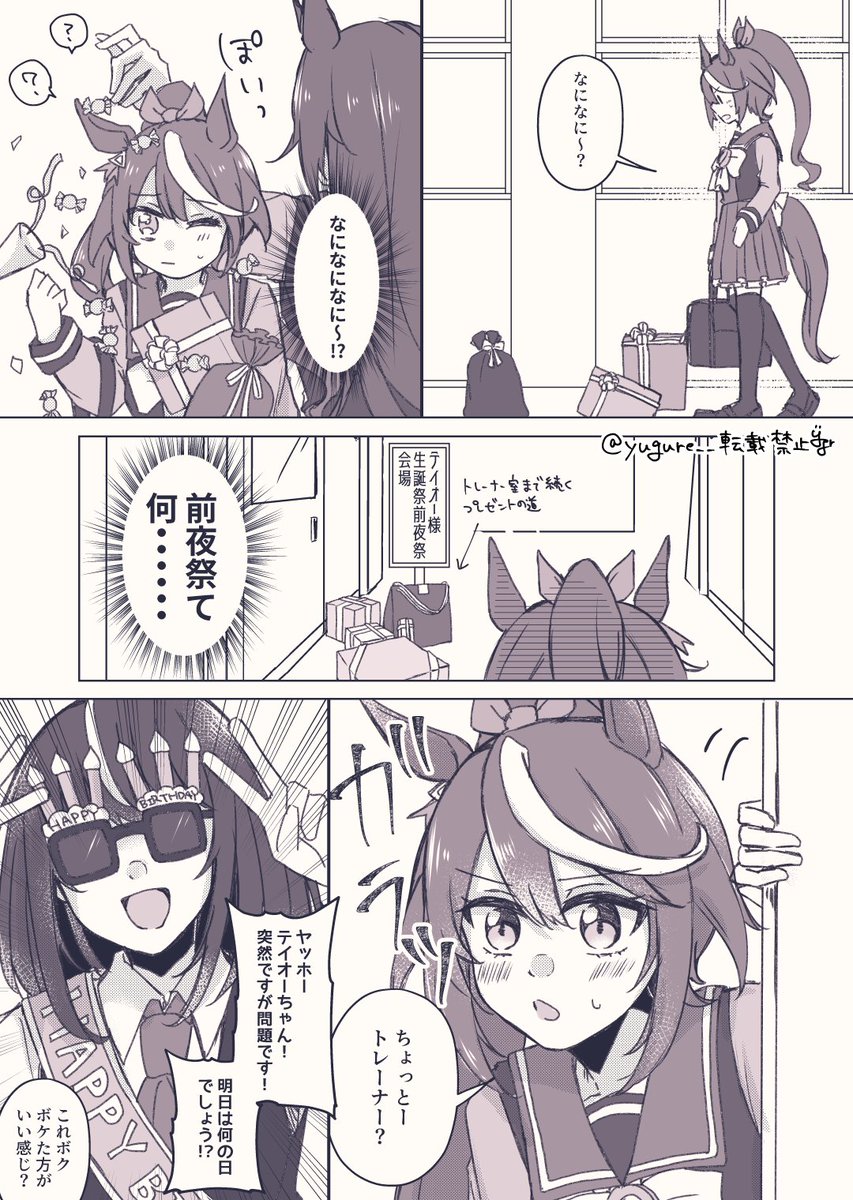 皆でテイオーちゃんの誕生日を前日から大袈裟に祝う謎の漫画です(女トレがいます)