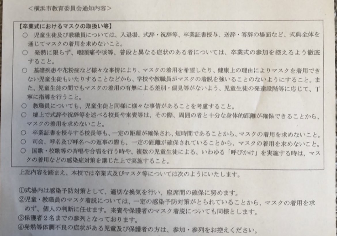 卒業式のマスクについて、と話したところ『国の方針に従ってー、距離やー声出しやー換気がー🤖』と始まり悔しくて悲しくて泣いてしまった、、