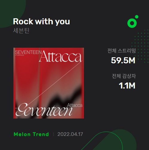 "Rock with you" by #SEVENTEEN has surpassed 1.1 Million unique listeners on MelOn. It is their 16th song to reach this mark.