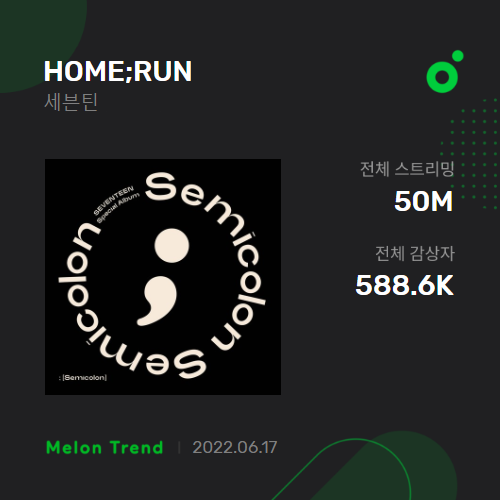 "HOME;RUN" by #SEVENTEEN has surpassed 50 Million streams on MelOn. It is their 12th song to achieve this milestone.