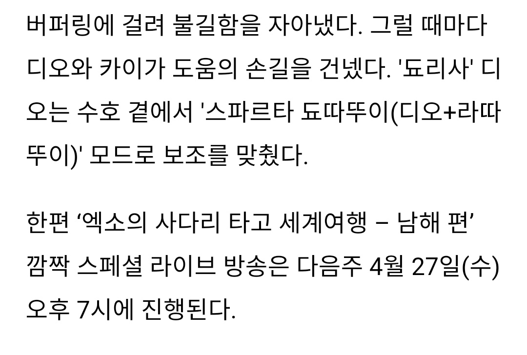 '엑소의 사다리 타고 세계여행 - 남해편' 깜짝 스페셜 라이브 방송은 다음주 4월 27일(수) 오후 7시에 진행된다