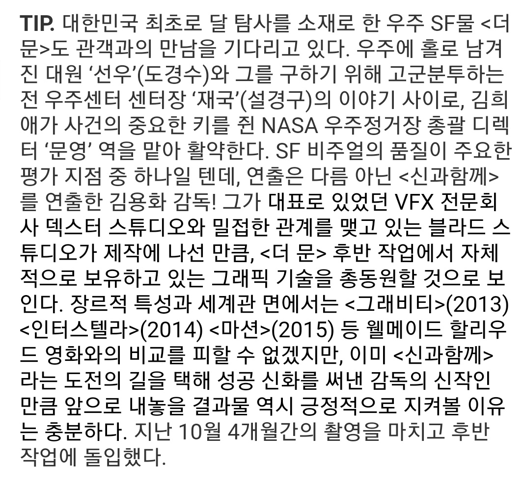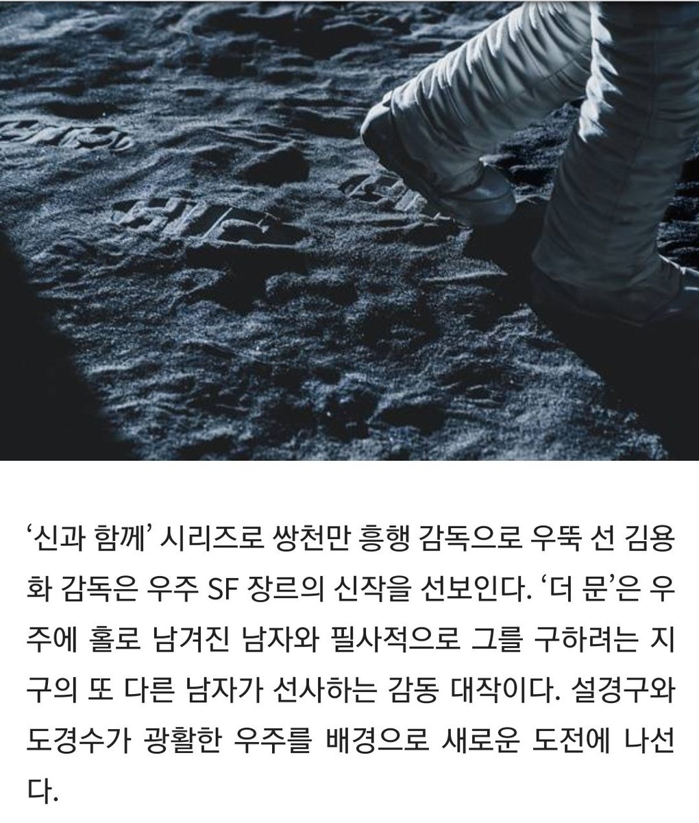 ‘신과 함께’김용화 감독은 우주SF 장르의 신작을 선보인다.‘더 문’은 우주에 홀로 남겨진 남자와 필사적으로 그를 구하려는 지구의 또 다른 남자가 선사하는 감동 대작