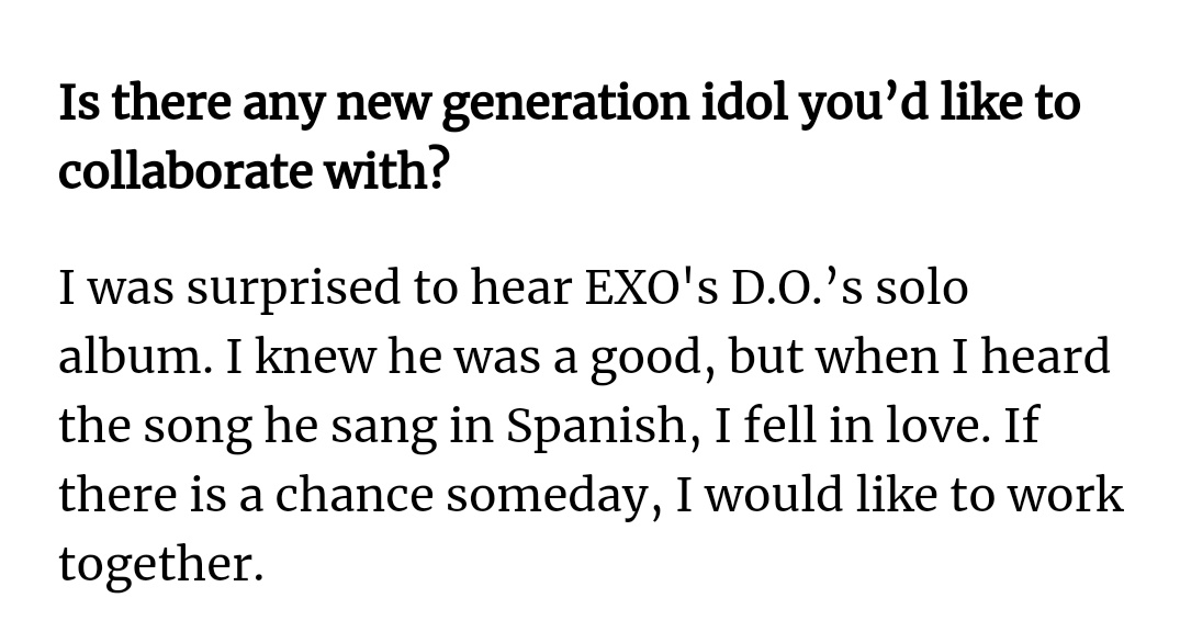 엑소디오의 솔로 앨범을 듣고 깜짝 놀랐다 그가 노래를 잘한다는 것을 알고 있었지만, 스페인어로 부른 노래를 듣고 사랑에 빠졌다 언젠가 기회가 된다면 함께 일하고 싶다
