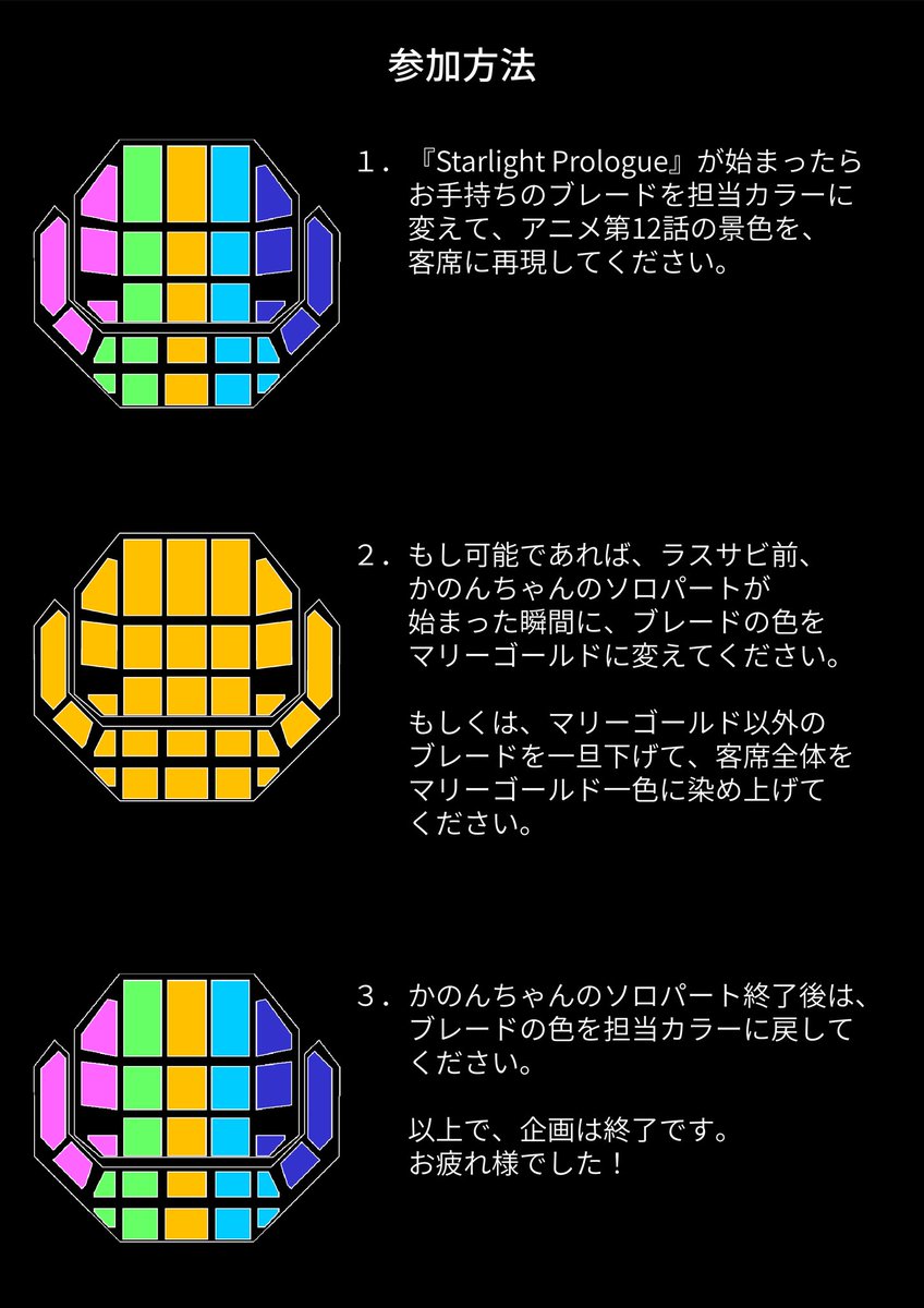 参加方法の 1 には「始まったら」と書いてありますが、曲前のかのんの挨拶(「皆さん初めまして…」の部分)があった場合はそのタイミングで変えて頂いて結構です。