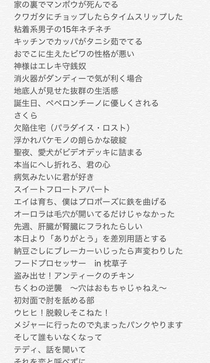 RTで流れできて久々に家の裏でマンボウが死んでるPの名前見た!曲聴き治してみよ!って人たち〜〜〜。「家に帰ると妻が必ず死んだふりをしています」は僕の曲じゃないですよ〜〜〜。映画化された時たくさんの人に祝ってもらったけど僕関係ないんですよ〜〜〜。
