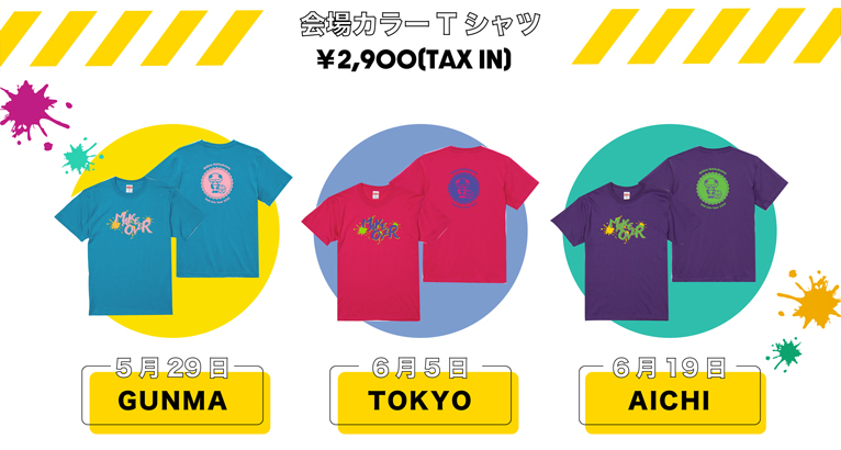 ツアーグッズ、リリースアパレルライン商品の他、今回より群馬・東京・愛知公演の会場カラーグッズも販売✨