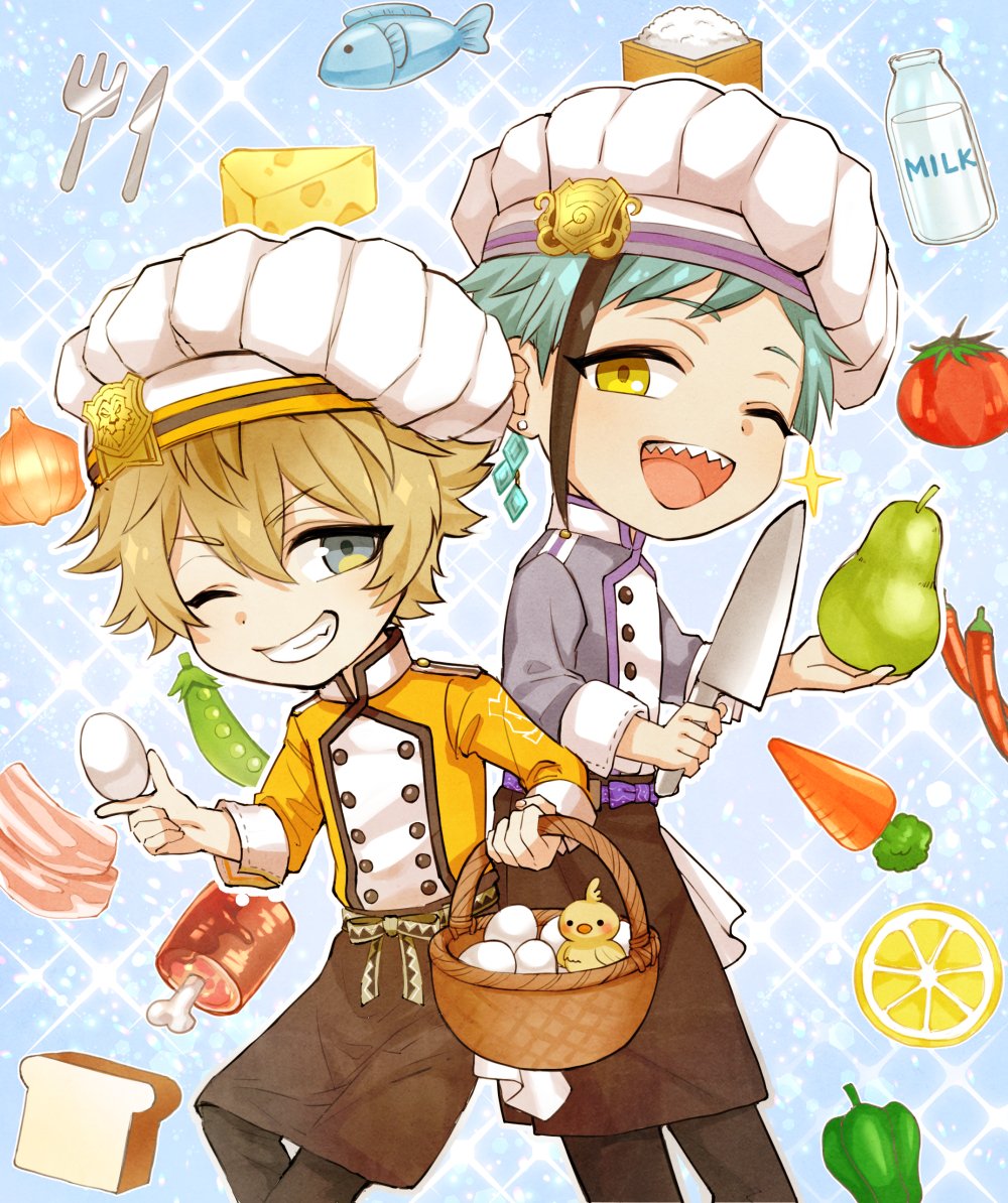 だいぶ前にmy推し2人のマスシェフ姿はよ見たい~ってラフだけ描いてたんですが、らぎくんが来たので仕上げました🐣卵料理おいしそう...