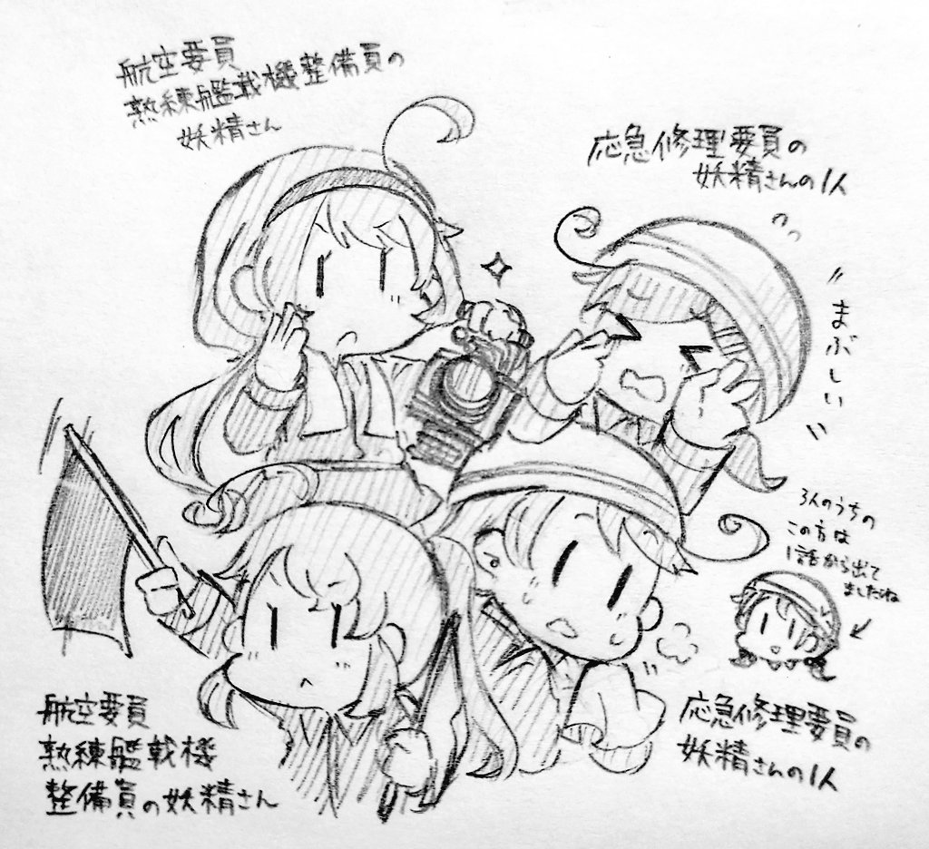 【※艦これ2期2話ネタバレ有】① 2話に出てた妖精さん描きました。半分想像のとこもあるしオリジナル?妖精さんもいるので話半分で見て頂ければ。①はまだ分かりそうな方々です。