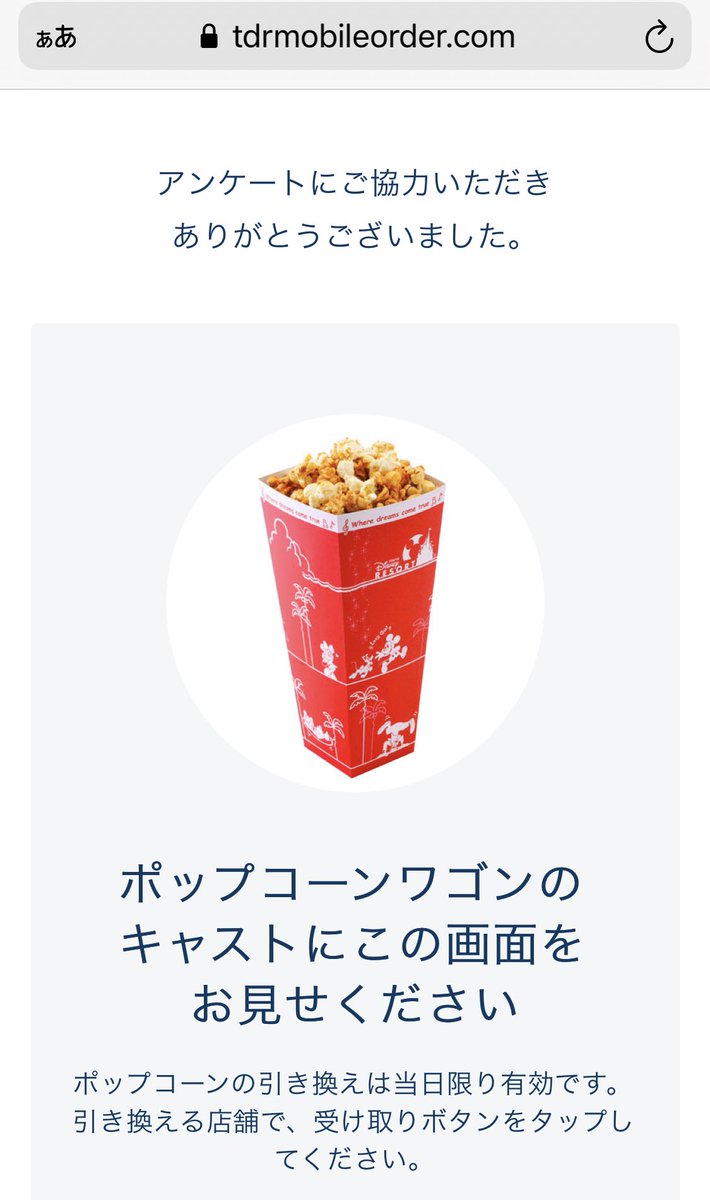 注文終えた後にアンケートに答えると、当日引き換えれるポップコーン引換券もらえるよ❣️