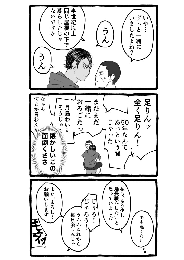 鯉、海にいる月のところに来ては帰りに一緒にご飯食べて、「今日はどうだった」とか「水が冷えてきた、温かいうちに上がれよ」とかいってたと思うし、そろそろ季節が変わって本気で寒くなってきたから潮時だろうと思って「いつまで…」と声をかけたんだと思う(妄想)