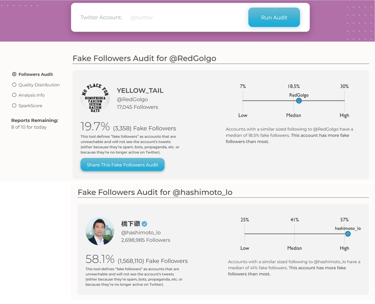 気になったので橋下徹のツイッターアカウントのフォロワーを調べたら、58%=156.8万アカウントがFAKE判定されました(スパムアカウントや非活動的なアカウントなど)。(ちなみに私のアカウントは19.7%)