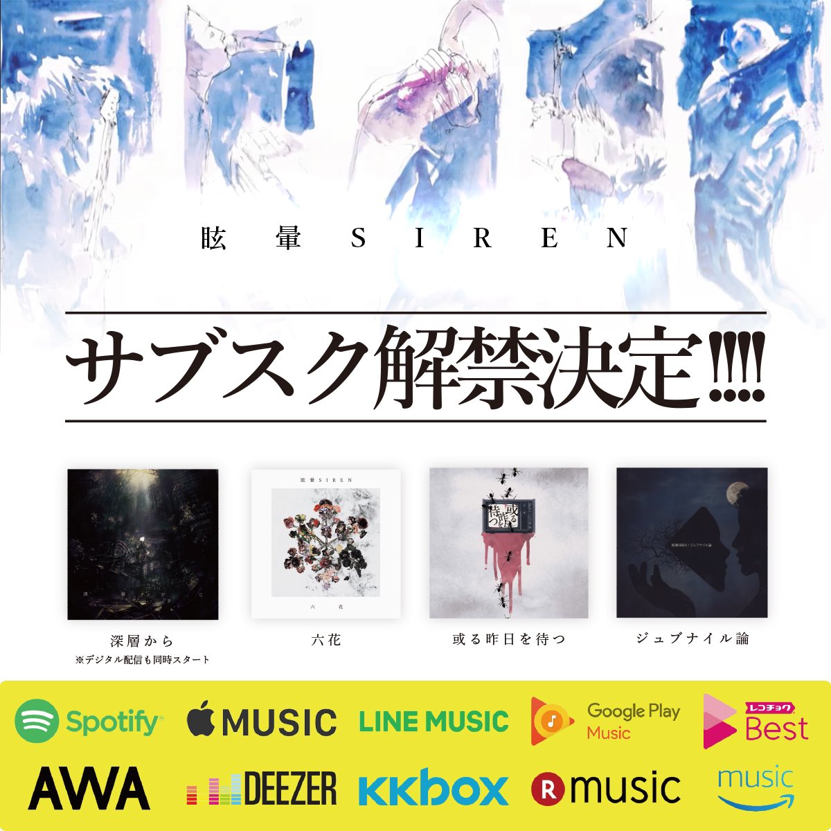 いつでもどこでも眩暈SIRENの楽曲が聴けるようにと、お声を頂いてたのでサブスクを解禁致しました。是非ご利用下さい。