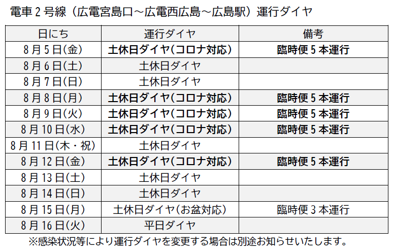 新型コロナの影響により、宮島線を担当する西広島営業所で、従業員の確保が困難な状況となったため、2号線(広電宮島口~広島駅)について、8/5(金)~8/15(月)の期間、通常より減便し「土休日ダイヤ」で運行します。