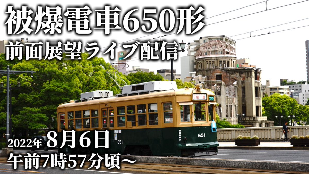 広島電鉄公式YouTubeチャンネルでは、明日7:57頃より、運行中の650形にて運転台の車窓から見える風景をライブ配信いたします。