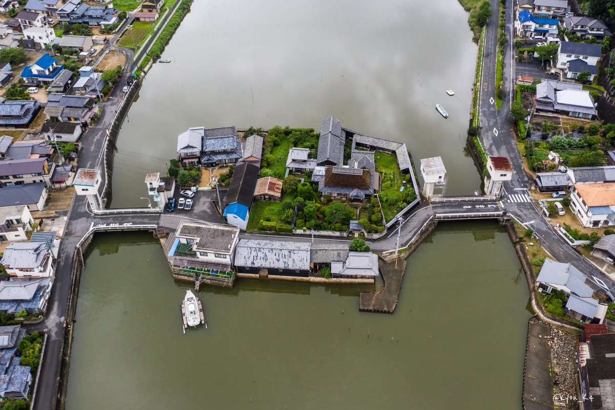 水門の家。 川のど真ん中に屋敷が立つ不思議な景観がありました。