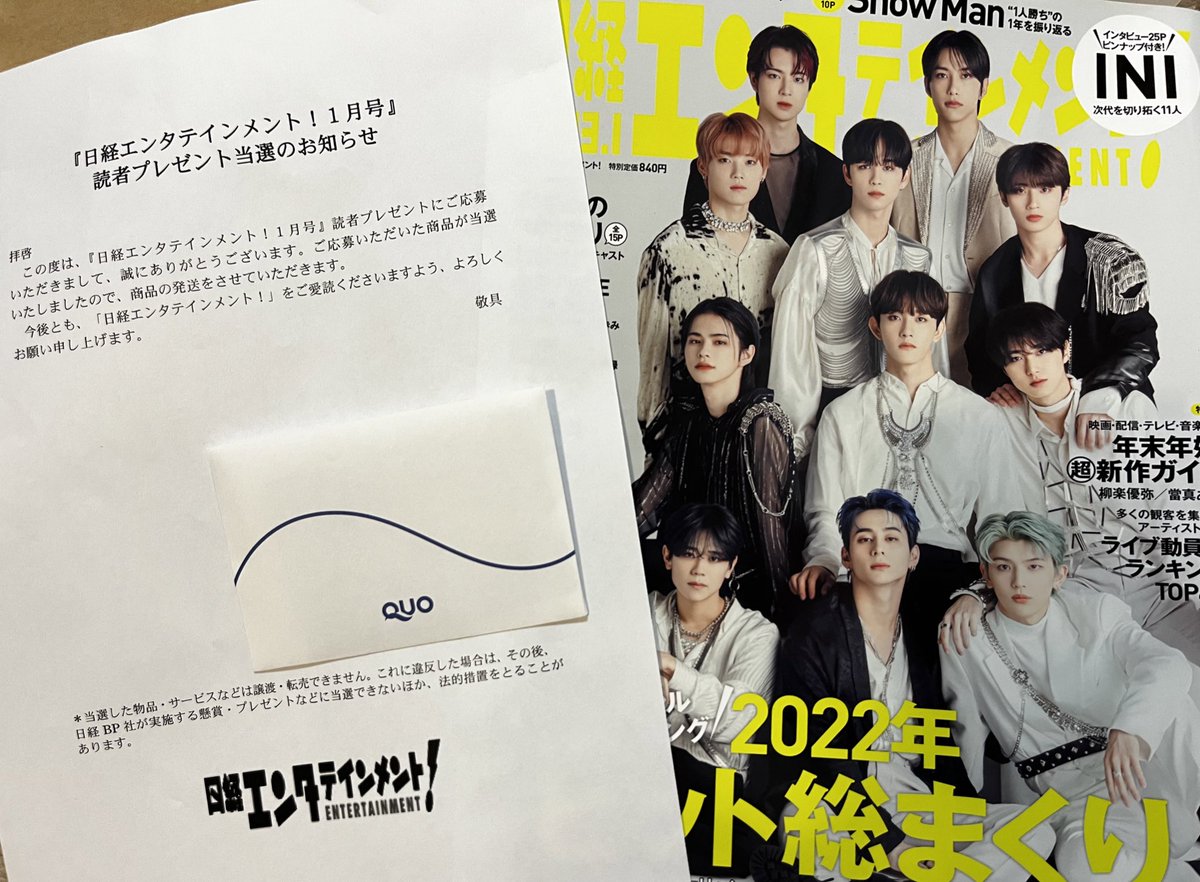 日経エンタテインメントさんのアンケートでINIを表紙へ起用してくださった感謝を綴ったらまさかの当選しててQUOカード1万円分いただきましたありがとうございます、、😭 今後ともINIをよろしくお願い致します…🙇🏻 @nikkei_ent #INI @official__INI
