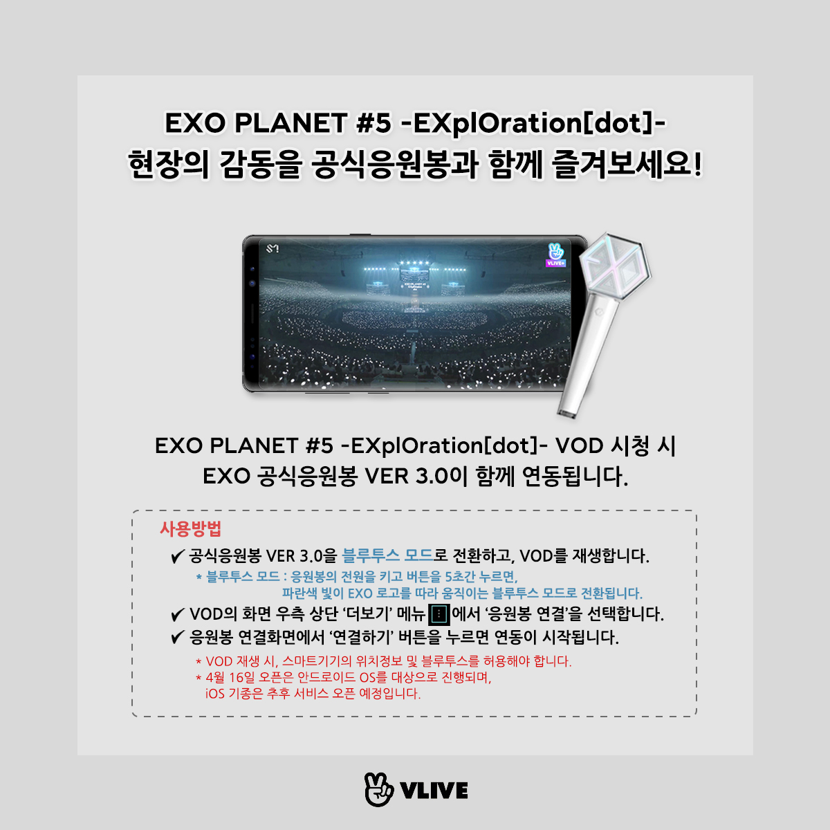 🚀EXO PLANET #5 - EXplOration [dot] - 🚀 VLIVE+ 영상을 EXO 실물 공식 응원봉을 흔들며 시청하세요! 자세한 내용은 이미지를 참고해주세요. ※안드로이드 V앱 최신버전(4.8.4)에서 사용 가능하며, iOS는 추후 안내 예정입니다.