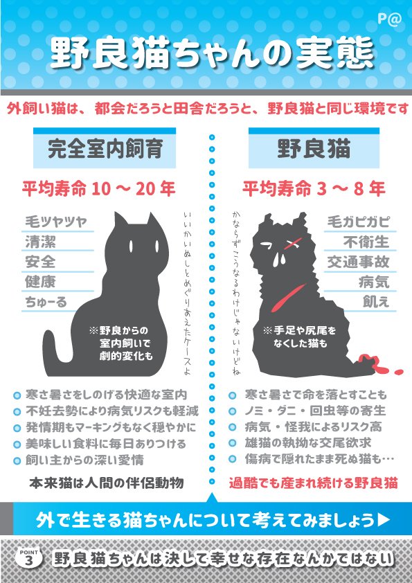 昔は当たり前だった外飼いですが、現在は様々な危険がわかってきました。 ・猫同士のケンカによる怪我、感染症 ・野生動物による喰殺、怪我、感染症 ・交通事故による死亡、怪我 ・連れ去り、虐待、暴力 ・迷子 ・糞尿被害による近隣トラブル これらから猫を守るため、室内飼育をしましょう!