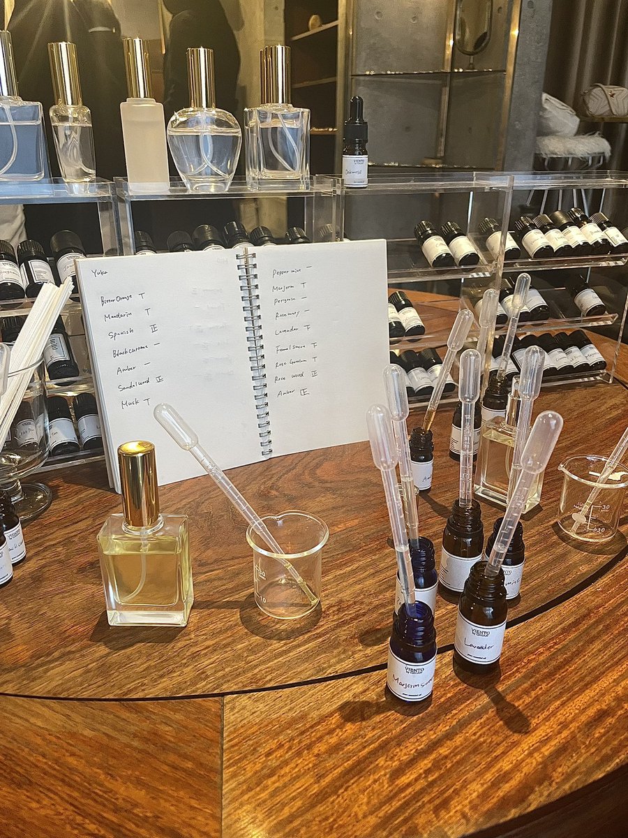彼とatelierGAGANでやっているオーダーメイド調香体験へ。100種類以上の植物香料からすきな香りを選んで、選んだ香料をブレンドして世界にひとつだけのフレグランスを作れるの。東京でこんな体験ができるなんて!クリスマスにとっても素敵な思い出ができた。