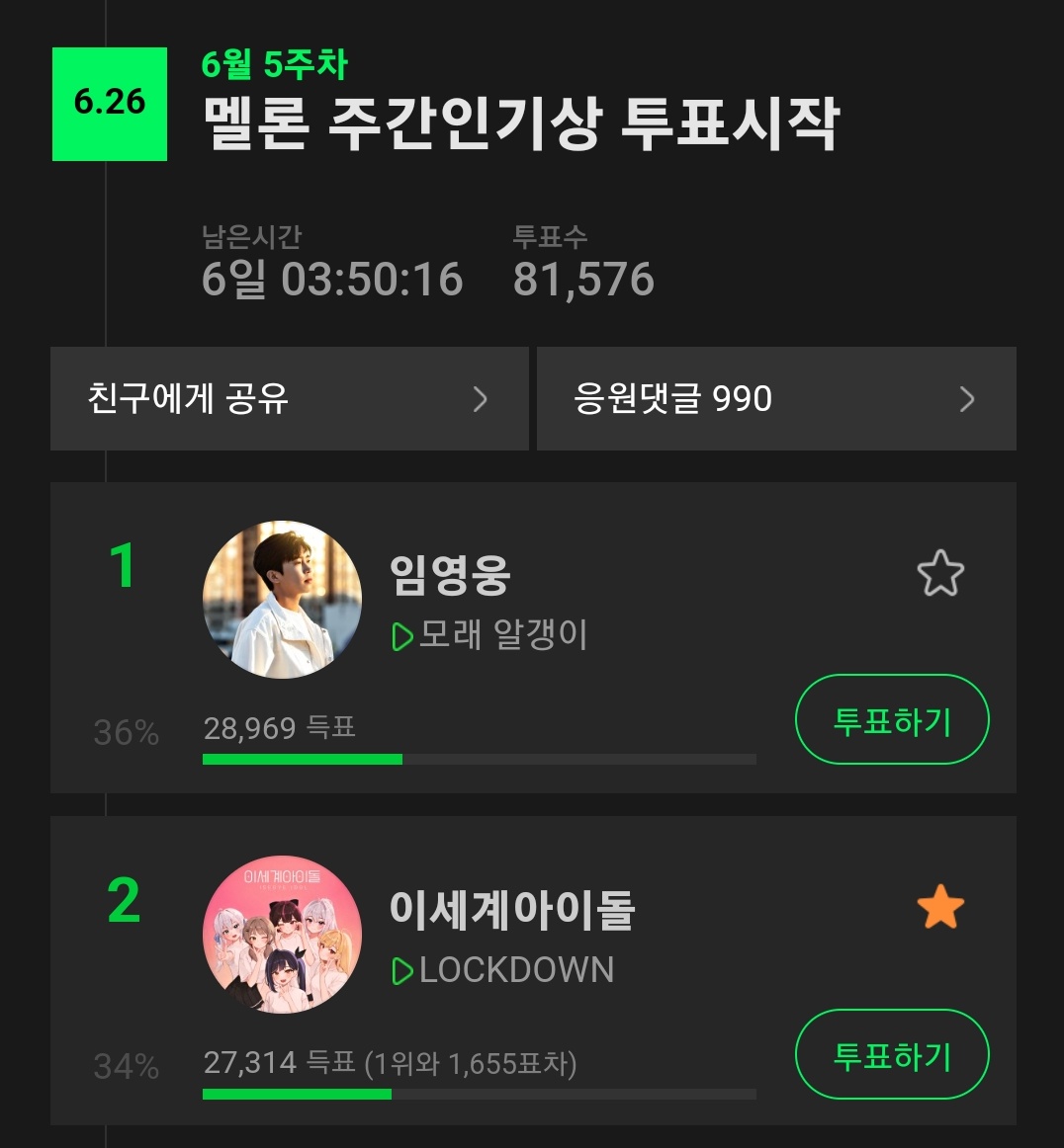 하루가 지나서 멜론 주간인기상 투표권이 리셋됐어요!!!