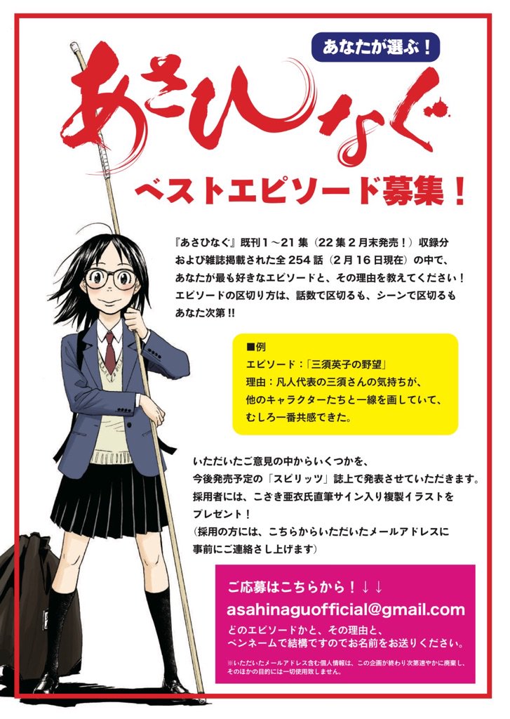 来週月曜発売のスピリッツでは、映画版の旭を演じる西野七瀬ちゃんのグラビア「ななせなぐ」も掲載!