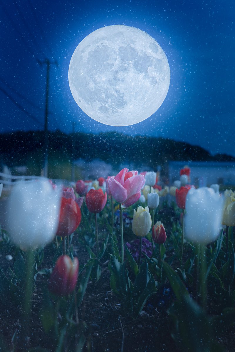 夕陽を浴びる色とりどりのチューリップ