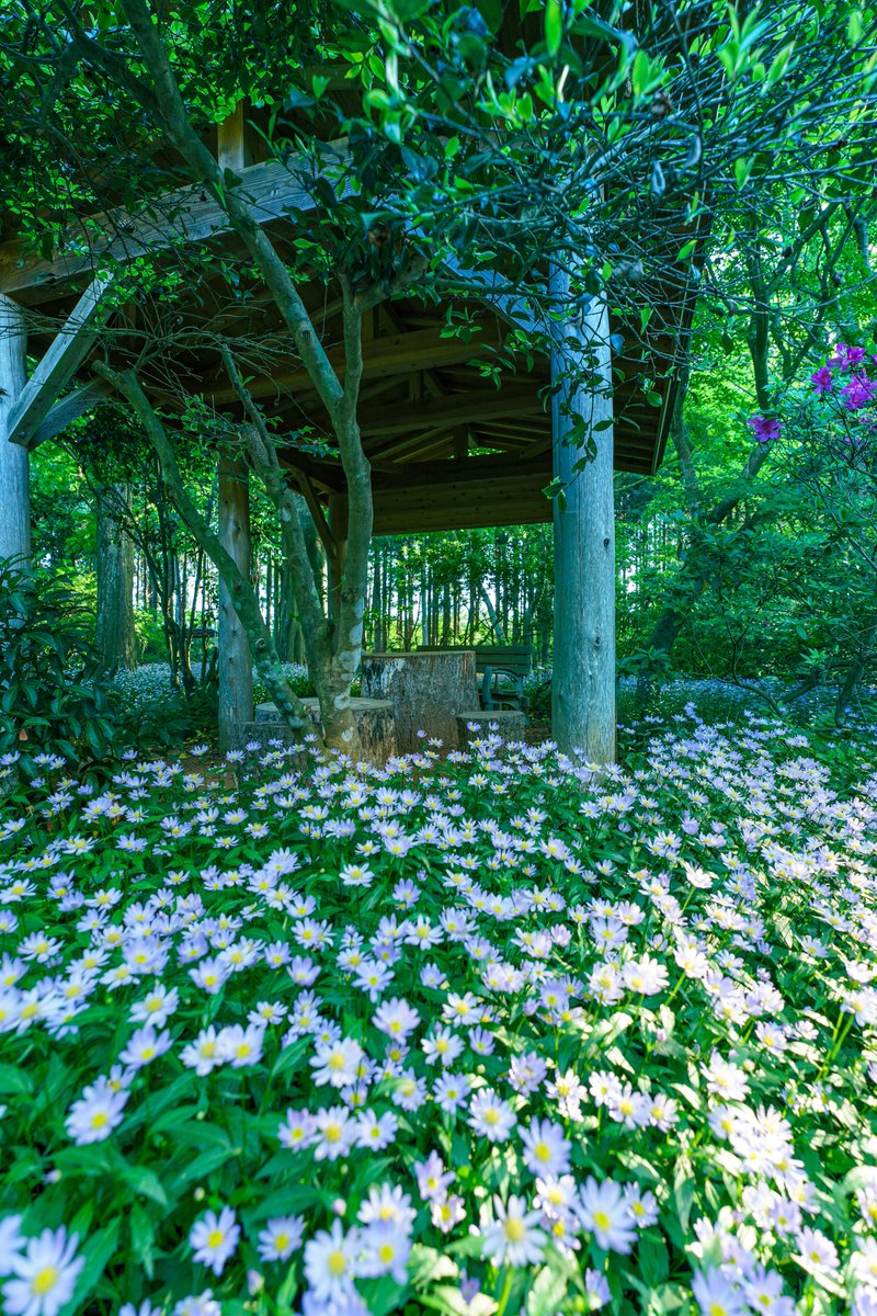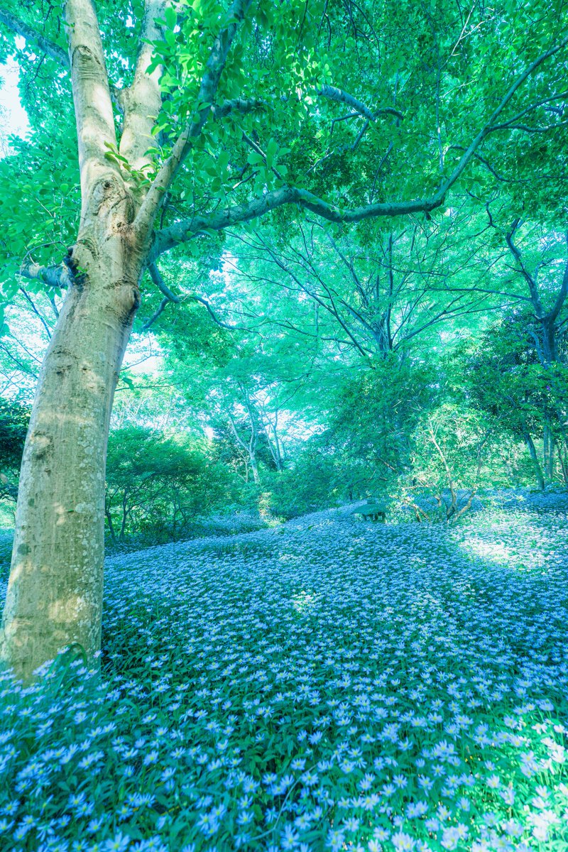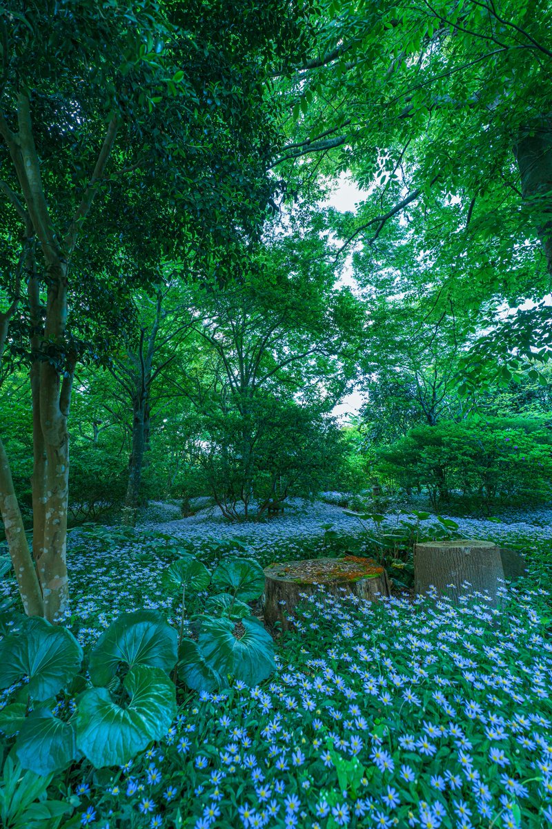 翠に包まれたミヤコワスレのお花畑がまるで天国