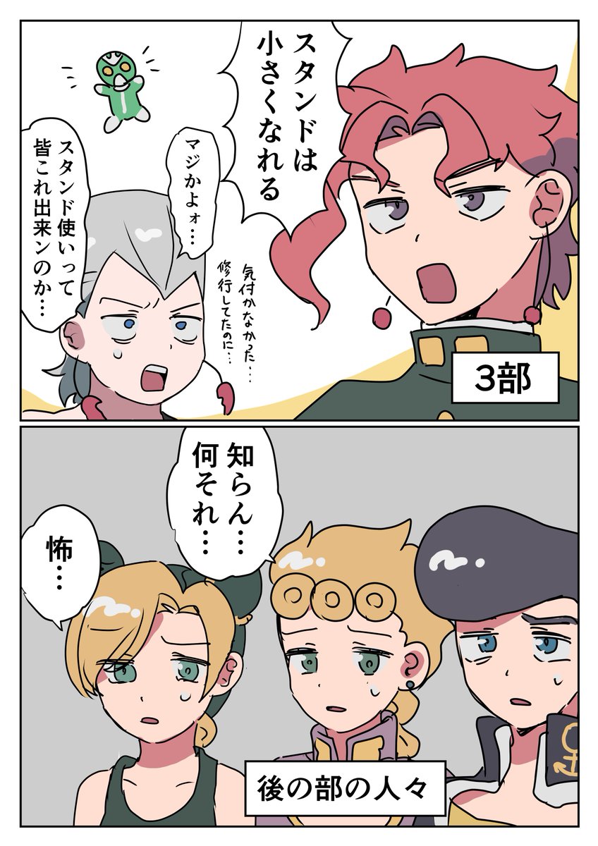 ぼく「ジョは奇数部がヤバい説を提唱したいんすけど」 先輩「ほーん」 ぼく「1、3、5、7部結構人死にするじゃないですか。だから9部もめっちゃ警戒してるんすよ」 先輩「1部言うほどかなあ」 ぼく「ほら、2、4、6、8は平和……え???平和じゃないな……あれ??あれ?……」 ぼく「ぜんぶだめだ」
