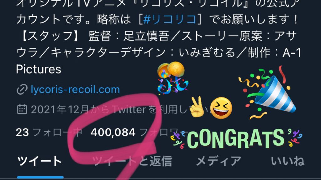 作品公式アカウントに続き、#喫茶リコリコ(@LYCO_RECO)も40万を突破しました🎊