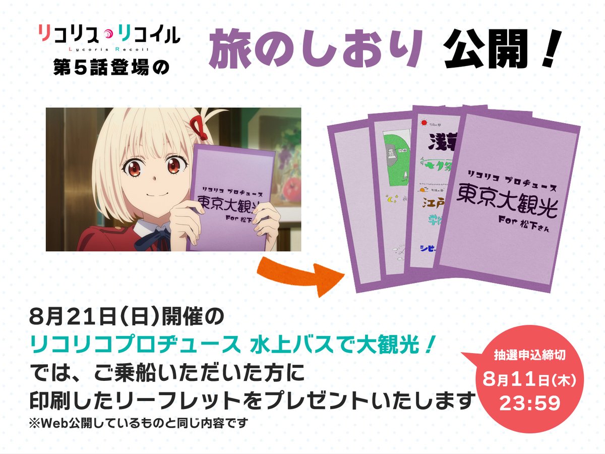 8/21開催「リコリコプロデュース 水上バスで大観光!」では、ご乗船いただいた方に印刷したリーフレットをプレゼント🎁