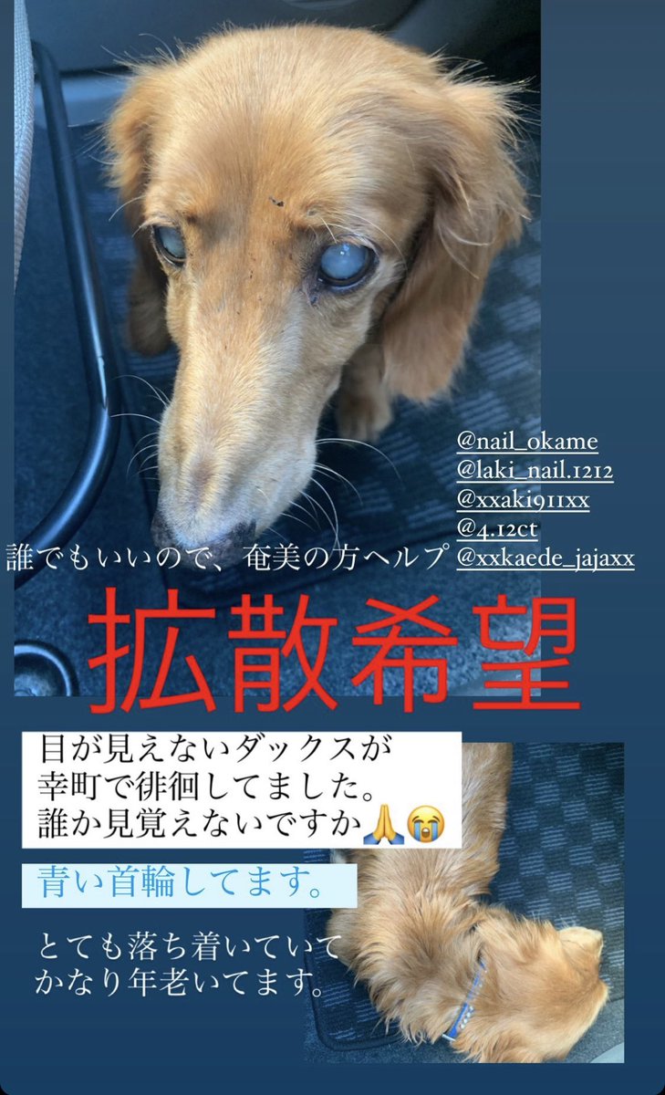 【拡散希望】 奄美大島の迷い犬情報 目の見えないダックスちゃんが幸町付近を徘徊してたそうです。 青い首輪をしてるとのこと。 早く飼い主さんの元に戻って欲しい! 心当たりのある方、ご連絡ください!
